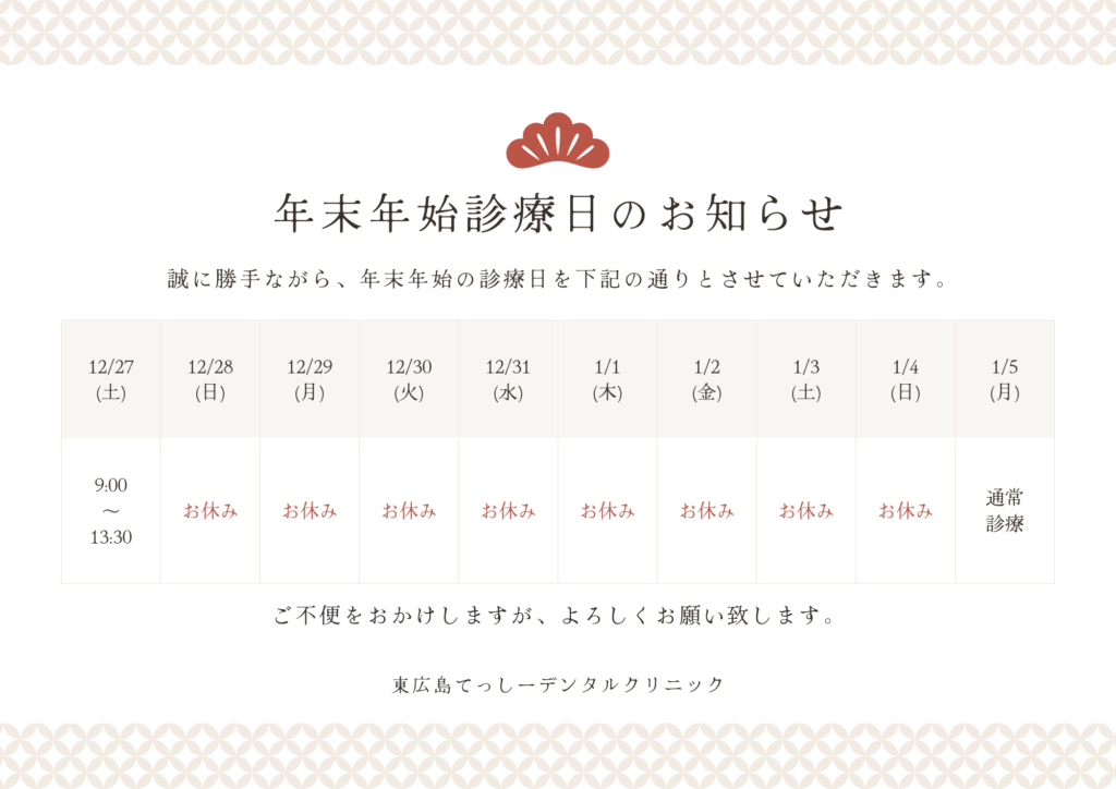 12月28日(日)~1月4日(日)まで休診とさせていただきます。1月5日(月)から通常通り診療いたします。